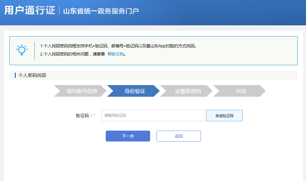 3.在验证身份环节涉及到三种验证方式:手机号+验证码方式、邮箱+验证码方式、爱山东APP扫脸认证,用户可自由选择。