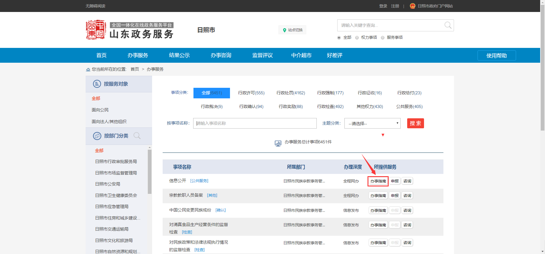 1.找到需要办理的事项,在右侧点击“办事指南”。